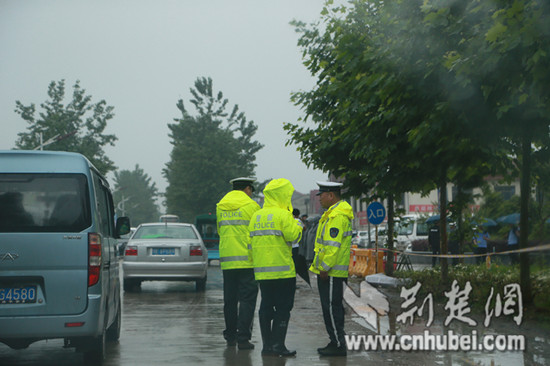 民警在风雨中疏导交通