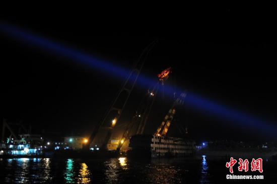 6月5日晚,“东方之星”客轮被整体打捞出水后,大批搜救人员在夜色中继续搜救。中新社发 张畅 摄