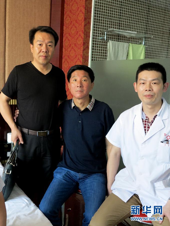 6月5日,“东方之星”客轮上幸存的上海游客、55岁的胡坚跃(中)与几天来一直陪在他身边的监利县上车湾镇党委副书记张骥(左)和照顾他的上车湾镇卫生院医生沈志雄合影。 6月5日下午,湖北省监利县,“东方之星”客轮幸存者、55岁的上海游客胡坚跃看到前来看望的上海市副市长赵雯时,搭着监利县上车湾镇党委副书记张骥的肩膀说:“他像亲兄弟一样,给我回家的感觉。” 胡坚跃在6月1日晚发生的“东方之星”客轮倾覆的最后瞬间,从客轮三层走廊处跃入江中,经过4个小时的漂流,在6月2日1点30分被海警船成功搭救。新华社记者 王蔚 摄