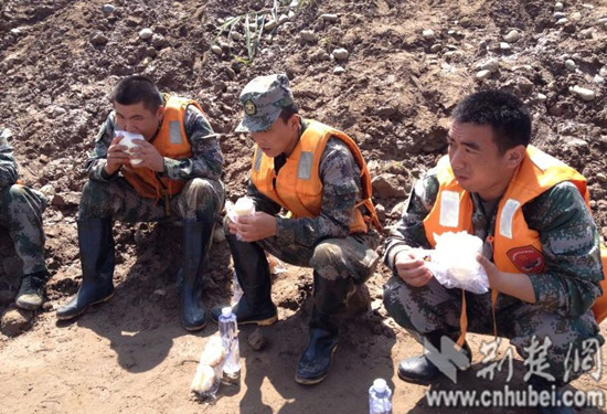荆楚网消息(记者余宽宏 通讯员何武涛、王晓永)6月6日上午9时,持续了一夜的搜救工作进入最后关键阶段。虽然早餐早在7点送达,但广州军区某舟桥旅战士们仍不愿上岸,顾不上吃饭,继续进行最后的搜救工作。10点10分后,才陆续上岸吃饭,10点37分,有的战士依旧没有吃早餐,他们的上一顿饭还是在昨天的下午五点。