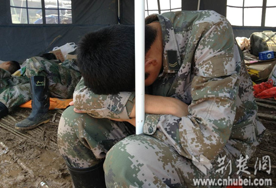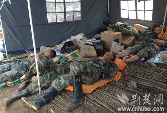 搜救还在继续,刚换下来的这一批战士倒头就睡
