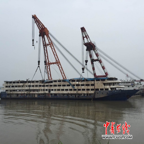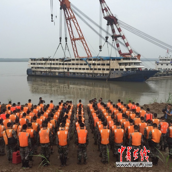 今天上午,湖北省军区某舟桥旅将对东方之星沉船进行最后一次清理,撤离时官兵向“东方之星”告别。中国青年报·中青在线记者刘世昕摄