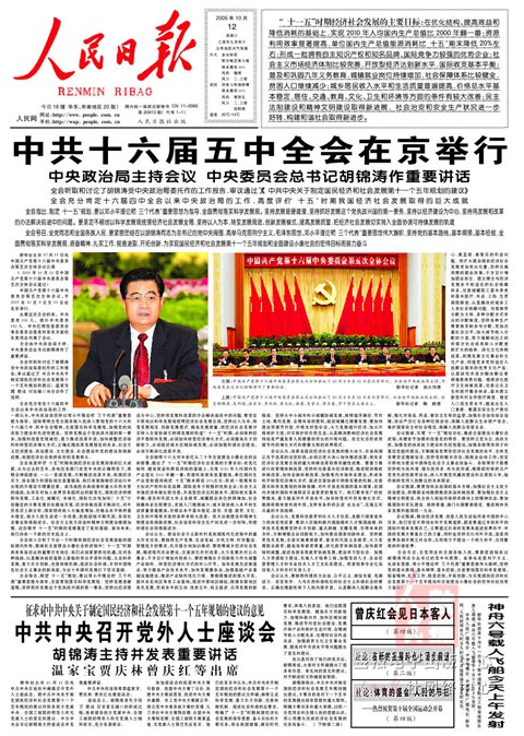 中国共产党第十六届中央委员会第五次全体会议,于2005年10月8日至11日在北京举行。全会通过《关于制定国民经济和社会发展第十一个五年规划的建议》。翌年3月14日,十届全国人大四次会议批准《国民经济和社会发展第十一个五年规划纲要》。