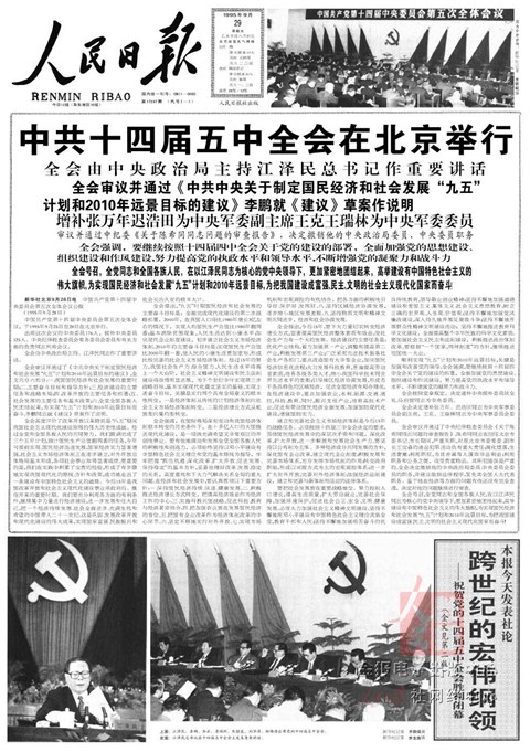 中国共产党第十四届中央委员会第五次全体会议,于1995年9月25日至28日在北京举行。 全会通过《关于制定国民经济和社会发展“九五”计划和2010年远景目标的建议》,提出要实行经济体制从传统的计划经济体制向社会主义市场经济体制转变、经济增长方式从粗放型向集约型转变两个具有全局意义的根本性转变。