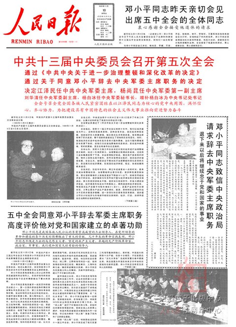 中国共产党第十三届中央委员会第五次全体会议,1989年11月6日至9日在北京召开。全会通过《关于进一步治理整顿和深化改革的决定》。全会高度评价邓小平对党和国家的历史贡献,强调他是中国改革开放和现代化建设“当之无愧的总设计师”,同意邓小平辞去中央军委主席职务,决定江泽民任中央军委主席。