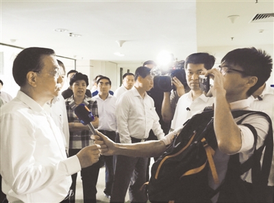 李克强在天津泰达医院看望伤者时,一名记者追问“编外消防员”问题。