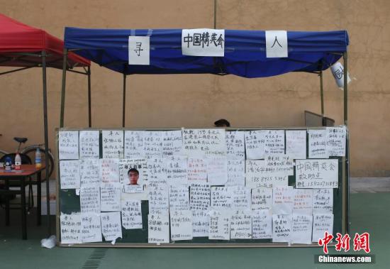 8月17日,天津滨海新区泰达第二小学安置点里的一块告示牌上,密密麻麻地张贴着寻人启事。中新社发 刘关关 摄