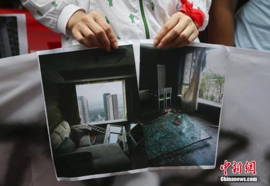 8月17日,天津港“8·12”特大火灾爆炸事故,民众展示房屋受损情况。中新社发 刘关关 摄