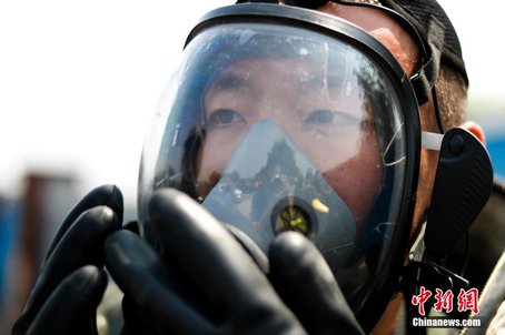 8月16日,北京卫戍区某防化团在天津港“812”特别重大火灾爆炸事故现场的驻地,防化兵准备进入核心区作业。