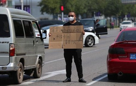 8月13日,天津滨海爆炸事故致部分医院物资药品短缺,市民志愿者烈日下路边举牌求帮助。东方IC