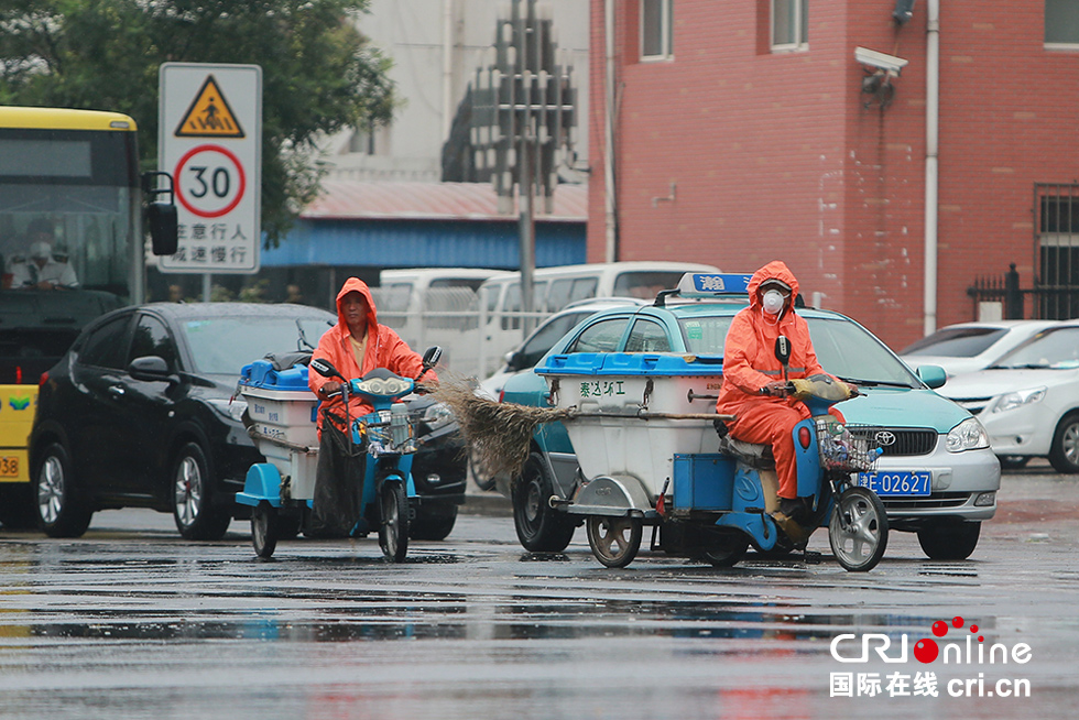 两位身披雨衣的环卫工人在雨中工作。摄影:沈湜