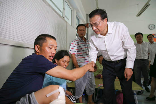 李克强总理16日下午前往天津泰达医院看望在“8.12”火灾爆炸事故中受伤的消防人员、公安干警和普通群众。他安慰病床上的伤者,希望他们安心养伤,早日康复。在医院大厅,他勉励医护人员进一步发扬人道主义精神,施展高超医术,最大限度减少死亡和伤残人数。