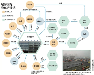 据媒体报道,天津当地多家公司与瑞海国际存在关联,主要是股东、董事、监事或高管人员的交叉。