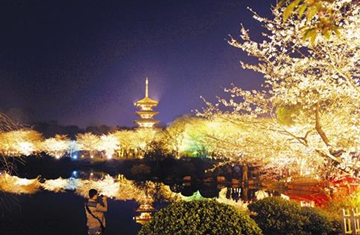 东湖樱园亮灯 花影湖色相映辉
