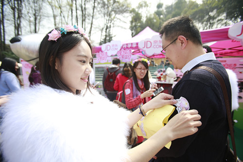 在京东商城展位前,游客和学生只要扫一扫京东微信,即可享受两次的JOY抓抓乐,把JOY公仔抓回家,并可享受JOY欢乐拍,免费打印照片一张,还可免费领取京东电子书畅读VIP卡等礼品。“3月21日一天时间,上千人在公仔娃娃机前排队,抓走了500多个JOY公仔。”京东华中区校园业务及金融部负责人魏威表示,选在樱花盛开时节,在武大搭建展台,就是看中了这里超旺的人气。他们希望借此推广品牌的同时,让更多人了解面向学生开展的相关业务。