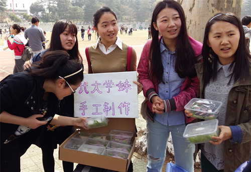 临近中午,赏花的游客们也感觉肚子饿得咕咕叫了。在樱花大道南侧的操场,“武大学妹手工制作”的寿司吸引了游客们的注意。“每盒根据口味不同,售价20元到30元不等,都是我们亲自制作的。”四个武大女生说,这些寿司是她们晚上加班赶制出来的,人工成本太高,基本不赚钱。“昨天收到一张100元的假钱,大家一天白忙活了,感觉有些恼火。”女生们感慨说,赚钱很辛苦,希望游客诚信交易。