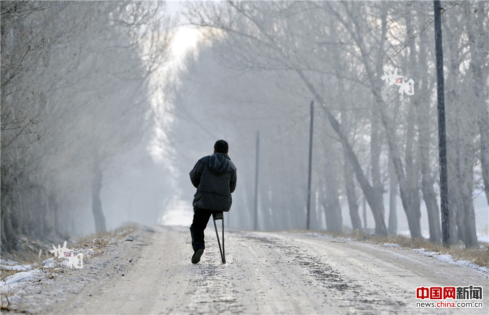 爸爸用拐杖支撑右腿在雪地上远去的背影。 宋利 摄