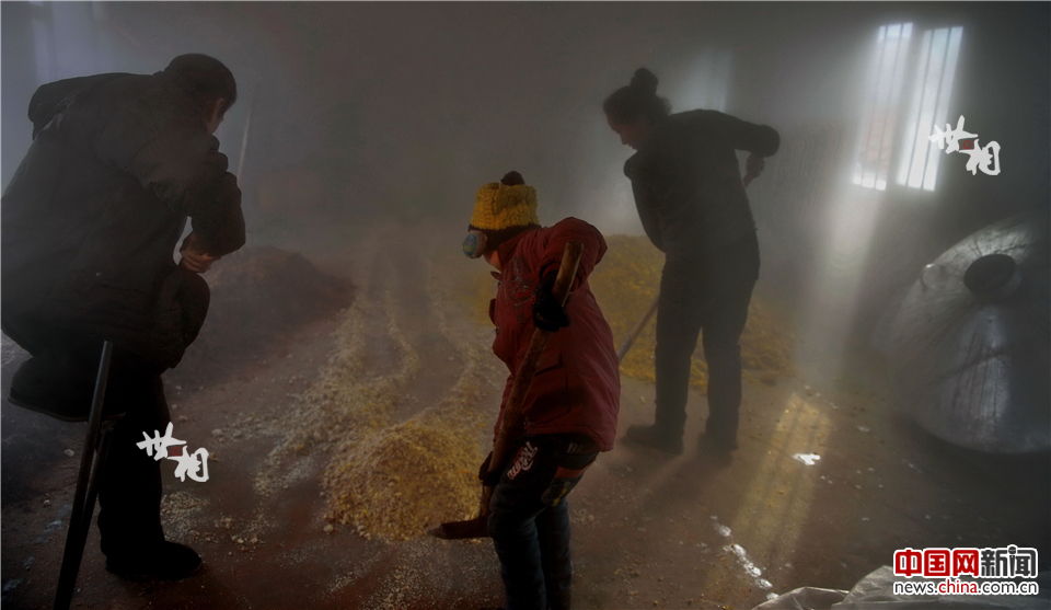 晨光中,全家人在合力翻铲酒醅。宋利 摄