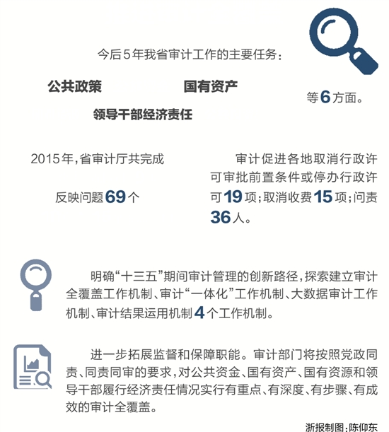 今后5年,浙江审计工作重点“审什么”“怎么审”?近日,省发改委和审计厅联合印发了《浙江省审计工作发展“十三五”规划》(以下简称《规划》),对“十三五”时期全省审计工作的目标、任务和措施作出了安排,推动我省审计事业科学发展。