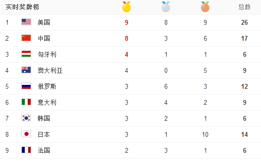 里约奥运第四比赛日奖牌榜 图片来源:新浪体育