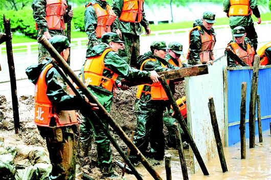出现险情的河堤长约100米,地势比其它处河段低,5处出现轻微漫溢的地方已经用沙袋加高。因为用铁锹等往编织袋内装沙土较慢,武警战士直接用手装沙土,个个满身都是泥巴。到昨晚7时许,抢险人员还没吃晚饭。