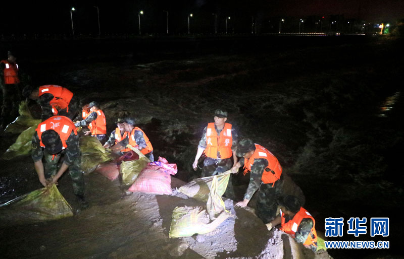 武警官兵在连夜抢筑堤坝(郭峰摄)