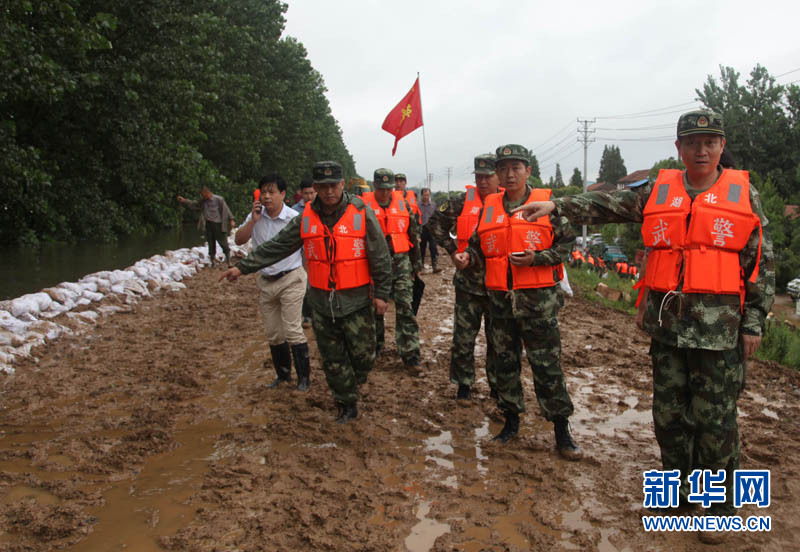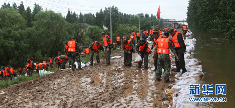 武警官兵在孝感市孝南区东山头沦河咀加筑堤坝(叶蔚 摄)