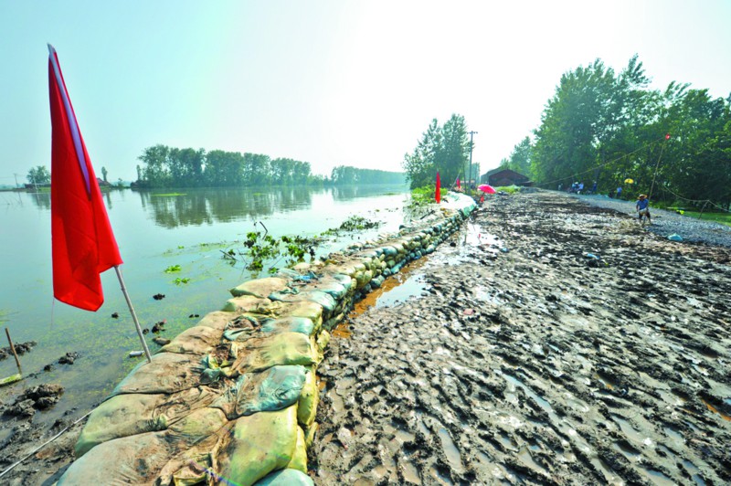 而就在6月30日,暴雨连下,大堤出现了滑坡,堤背在暴雨冲刷下,现出一条条小沟壑。4日凌晨,水位暴涨达到26.62米,大堤出现漫溢。村里几乎都是老弱病残,王维带了邻村80人,在堤内铺上彩条布,三次筑高子堤,控制住险情。“现在在密切关注水位,24小时不松懈,随时准备垒高子堤。”