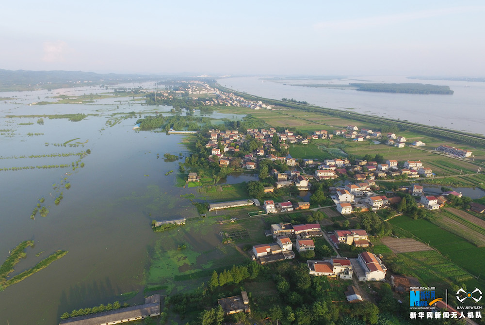 图为7月7日拍摄的被洪水围困的芦花村。左为望天湖,右为处于高水位的长江。新华社记者 余国庆摄