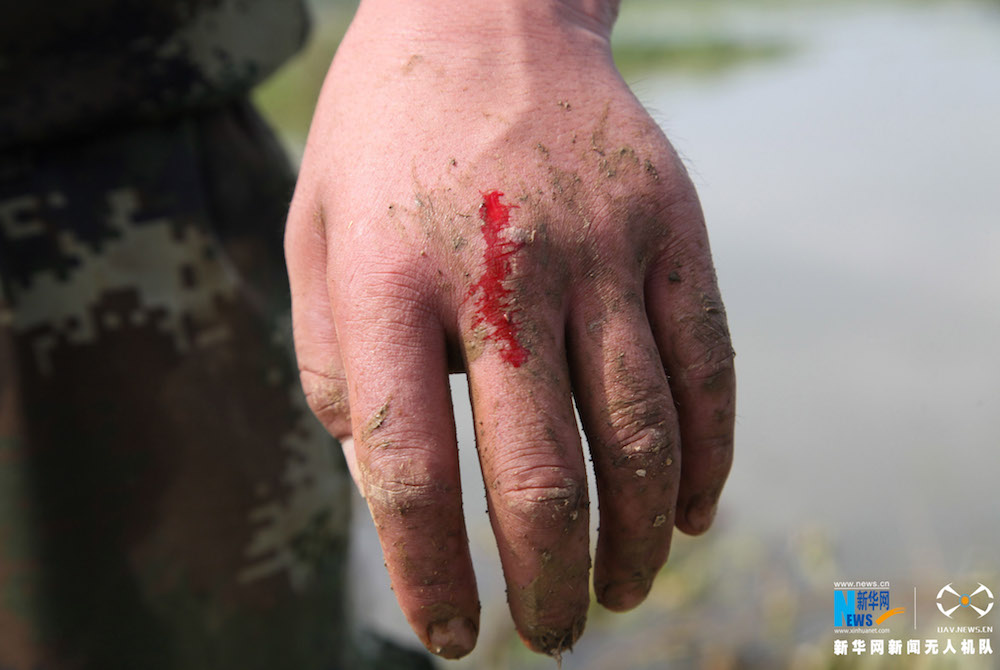 由于连续的强降雨,湖北省汉川市距城区60公里的垌塚镇老灌湖水位急剧上升,发生漫堤险情,危及垌塚镇16个村2万余村民和近三万亩农田。7月7日上午7时许,武警孝感市支队200名官兵紧急驰援,装填、转运沙袋,垒筑沙包加高加固大堤。由于天气炎热,周围道路狭窄,鱼塘和水田密布,给救灾带来一定难度。目前抢险扔在紧张进行中。图为7月7日,汉川市老灌湖抢险现场,一名战士手被磨破流出鲜血。新华网发 叶蔚摄