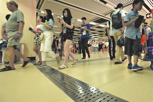 7月11日,记者来到了地铁中南路站点。走到C2出入口处,墙体旁边放置的绿色防滑垫,步行梯上穿梭的人群,丝毫看不出此前在暴雨中,这里一度停站。