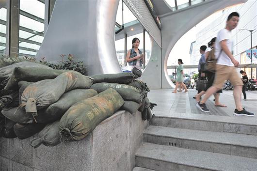 图为:站口堆放的沙袋可筑高台阶