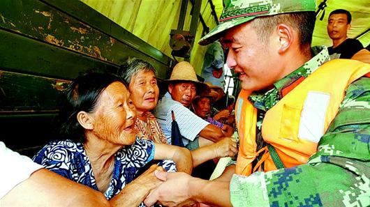 湖北日报讯 昨日,武警湖北总队一支队官兵转移群众时,一位73岁的老人紧紧握住战士的手说谢谢。当天,汉川垌塚镇多个村庄被淹。(记者 张朋视界网 马威 摄)