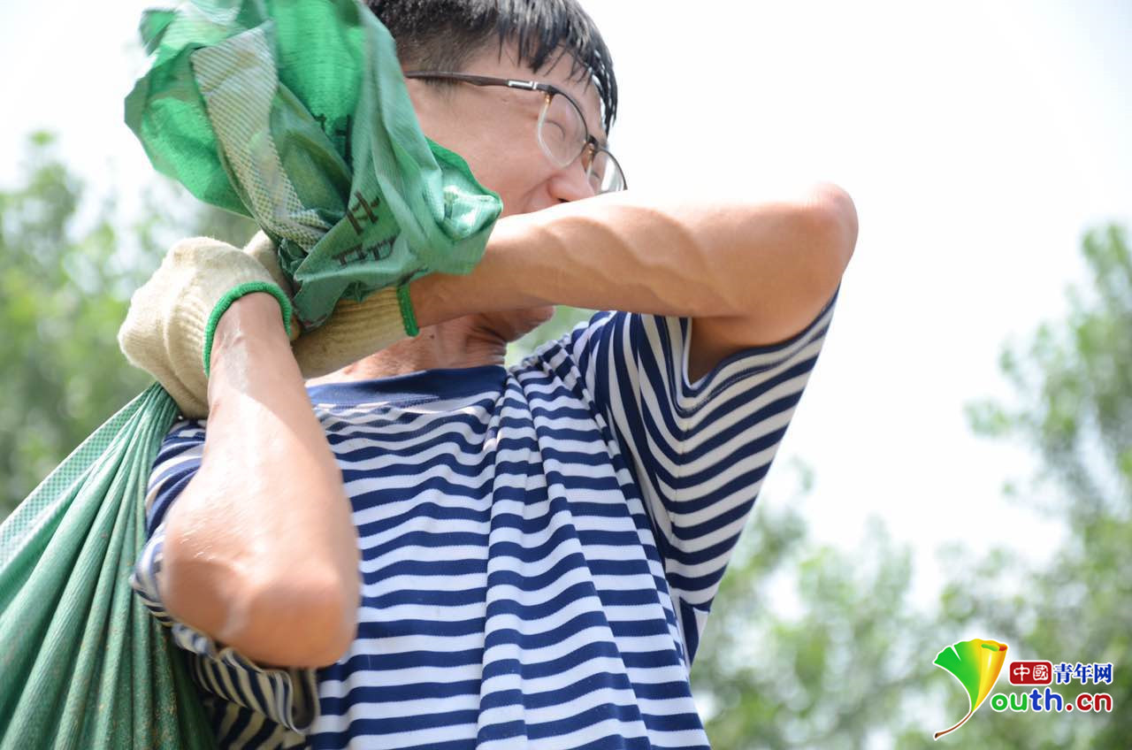"青马工程"的学员正在搬运砂石袋。 湖北团省委供图