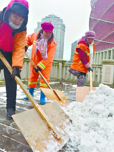 长江日报讯(记者黄师师 通讯员殷莉红 宋宏雷)昨日,一线环卫工人在天还没亮时,就开始撒盐化雪,清扫积雪,铺设草垫。为了抵御风雪,不少环卫工动用巧思,自制起抗风扫雪“神器”,获得市民点赞。