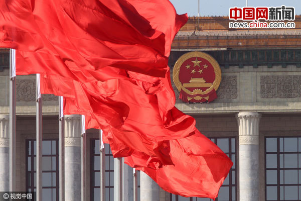 资料图:2017年3月2日,北京,有关部门对天安门广场及人民大会堂的楼顶悬挂了红旗,喜迎3月3日开幕的政协第十二届全国委员会第五次会议和3月5日开幕的第十二届全国人民代表大会第五次会议,许多中外游人在广场感受两会气氛。(视觉中国)