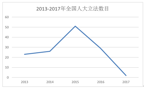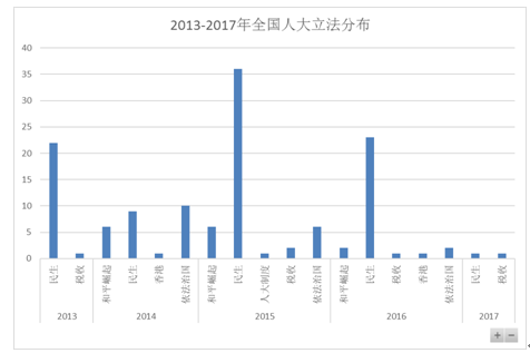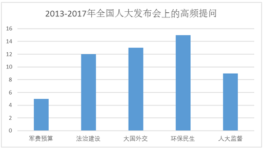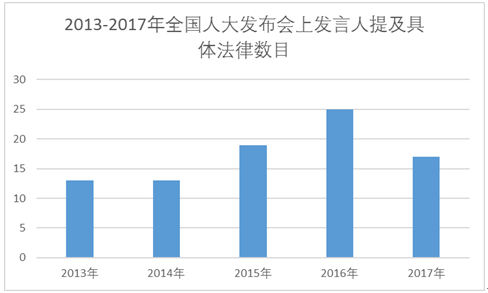 (实习研究员万科麟、艾玮宁、张岩、刘延洁、刘典对本文亦有贡献。全文制表:万科麟。全文高频词分析文本来源自新华网2013-2017年全国人大新闻发布会文字实录。人大历年立法数据源自中国人大网。)