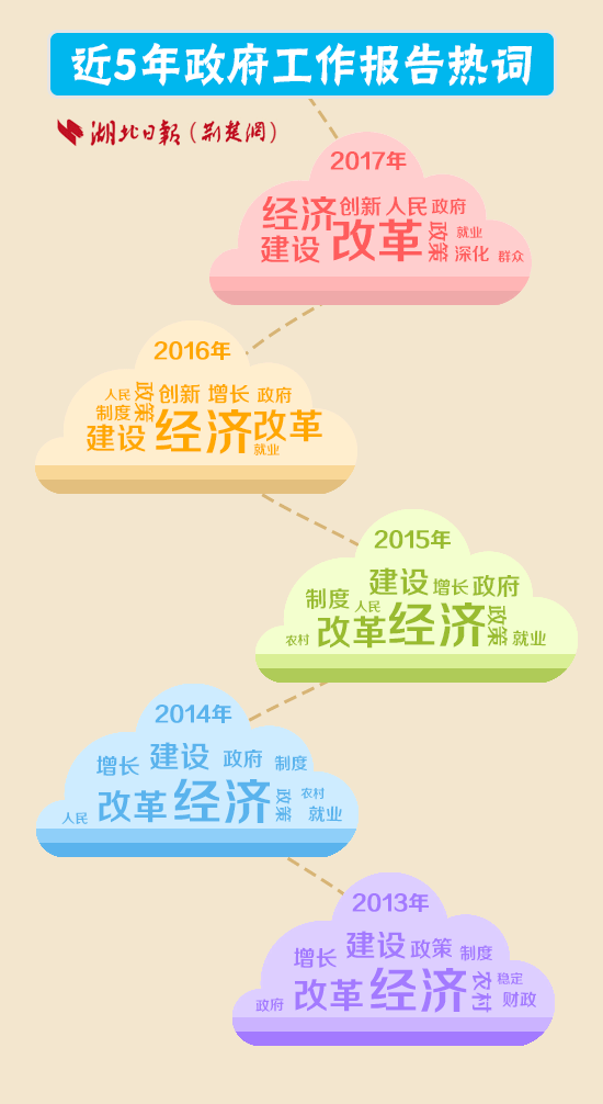 湖北日报(荆楚网)消息(记者 伍燚)3月5日,第十二届全国人民代表大会第五次会议在人民大会堂开幕,国务院总理李克强作政府工作报告。近5年来,全国政府工作报告中哪些关键词被提及次数最多?关键词背后又有哪些深意?舆论的关注点集中在哪里?湖北日报(荆楚网)将逐一为你解析。