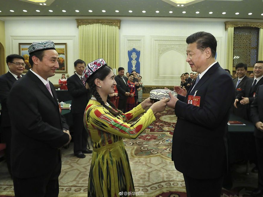 10日上午,习近平总书记参加新疆维吾尔自治区代表团审议。热汗古丽·依米尔代表和买买提依布热依木·买买提明代表向习近平敬献一顶花帽,表达新疆各族人民对总书记最崇高的敬意、最美好的祝福。习近平请他们转达对新疆各族人民的良好祝愿。