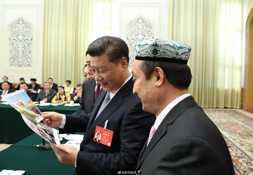 习近平向买买提依布热依木·买买提明代表了解他们村里每家有多少土地、是种粮食还是种果树,问他家里有没有认亲结对子,效果怎么样?习近平说,这项工作要扎实开展,让结对认亲取得实效。买买提依布热依木·买买提明说:“党的政策亚克西!”总书记也回应:亚克西!(文字/新华社记者霍小光,摄影/新华社记者兰红光、马占成、李涛)(据“新华视点”微博报道)