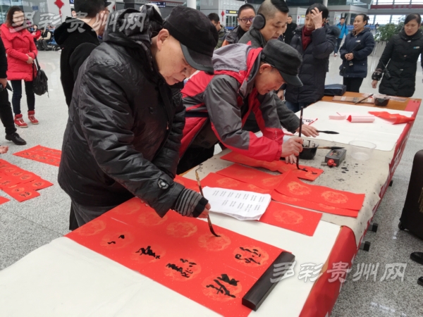 相比平时,春运期间的贵阳北站显得更加温情。在北站候车厅内,7位来自贵阳铁路老年书画协会的书画家们挥毫泼墨,写下一幅幅精美的对联送给过往的旅客们,让回家的路既平安又暖心。