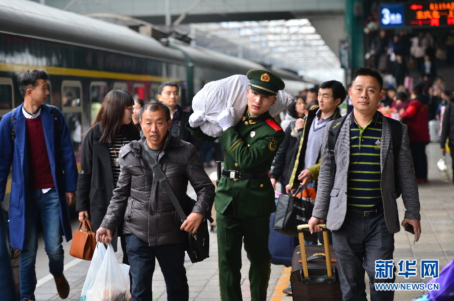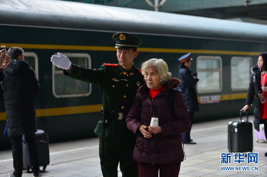 春运路上,除了因外出打工而回家过年的青年旅客们,年迈的旅客也不在少数。当看到这张图片的时候,小编就在想,倘若没有这位武警战士的搀扶与指引,这位白发苍苍的老人,会不会在人来人往的春运人潮中走失,甚至错过回家的班列。想到最后只能庆幸,还好有他在。新华网发(武警重庆总队供图)