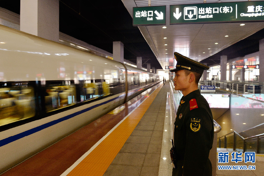 1月13日,重庆火车站北站,一位执勤的武警战士在站台目送列车的离开。在此之前,他或许帮旅客扛过行李,也可能为迷路的旅客指引过上车的方向,但是他并没有觉得累,而是目光坚毅的守护着万千旅客回家的梦。新华网 李相博 摄