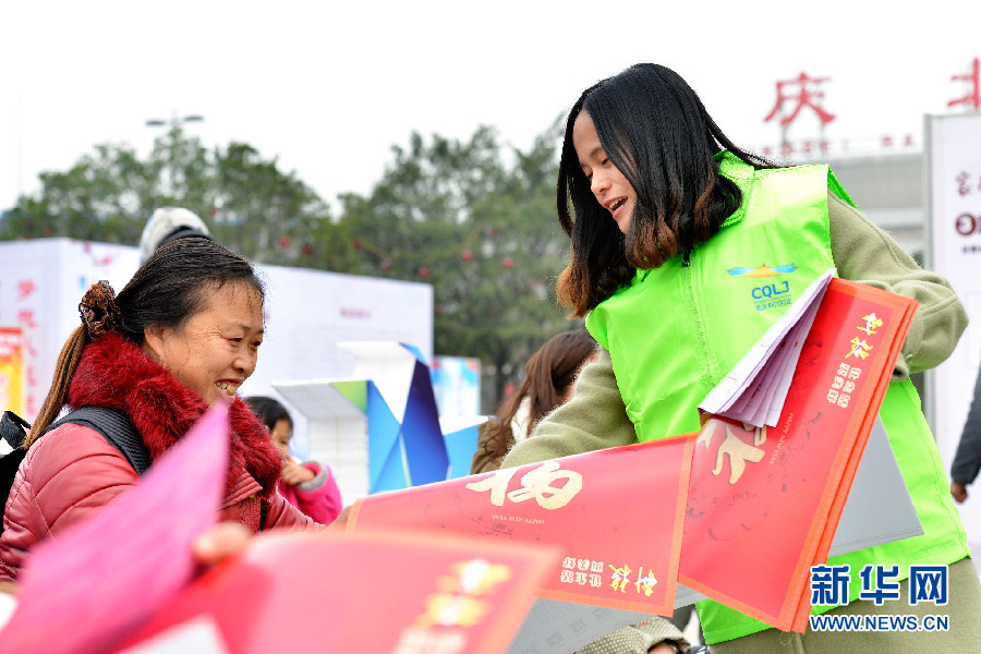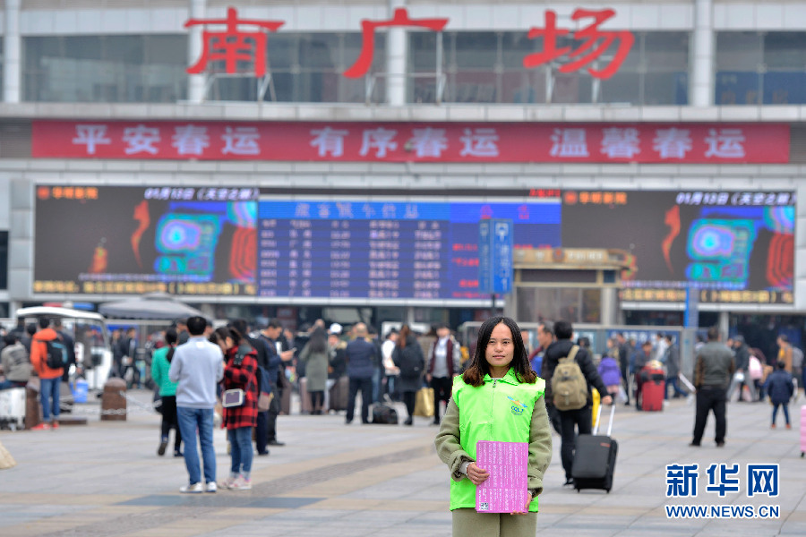 这是刘萍有空之余在重庆北站南广场拍的照片。她身后的横幅上写着“平安春运、有序春运、温馨春运”十二个大字,而她和她的志愿者伙伴们也正在为这十二个字而努力着。新华网 李相博 摄