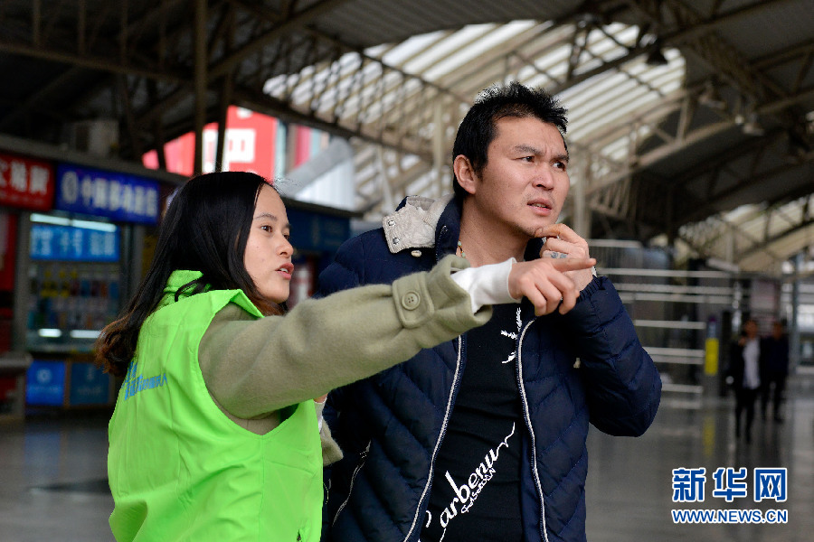 刘萍就是其中的一个志愿者,她志愿服务的区域是重庆北站。图为刘萍为旅客指路。在重庆北站,志愿者们穿上统一服装,为旅客提供信息咨询、购票引导、秩序维护、安全宣传、扶老助残进站乘车等“一站式全方位”服务。新华网 李相博 摄