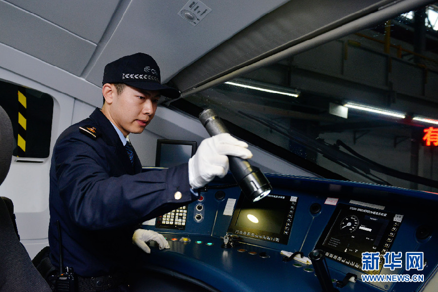 在司机上车前,杨凡需要对高铁列车的里里外外都检查一遍,确保每辆驶出动车所的高铁列车都是达到安全标准的。到达高铁站台后,在乘客上车前,杨凡还需对高铁动车进行再次安全检查,保证乘客安全。新华网 李相博 摄
