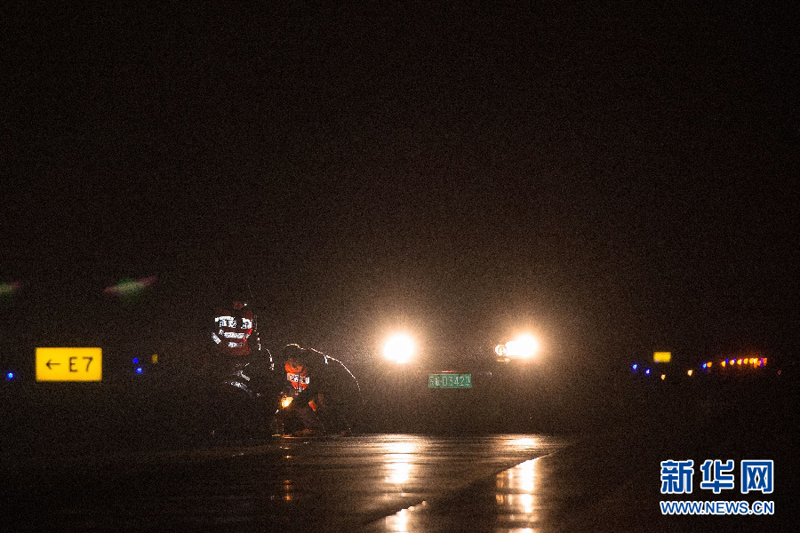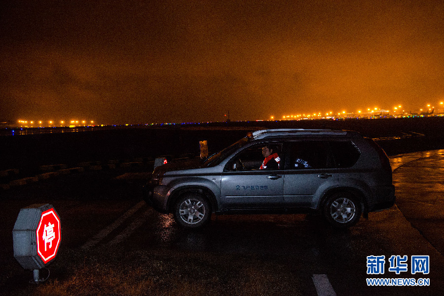 春运期间,也有不少人选择乘机回家。飞机的每次安全起飞着陆,都离不开机场的助航灯光系统。为了确保助航灯光系统的正常工作,每天凌晨,当航班数量减少后,江北机场的巡检维护电工便会来到跑道,巡查助航灯损耗情况。这是作业班组在跑道外等待塔台的允许进入跑道。新华网 李相博 摄