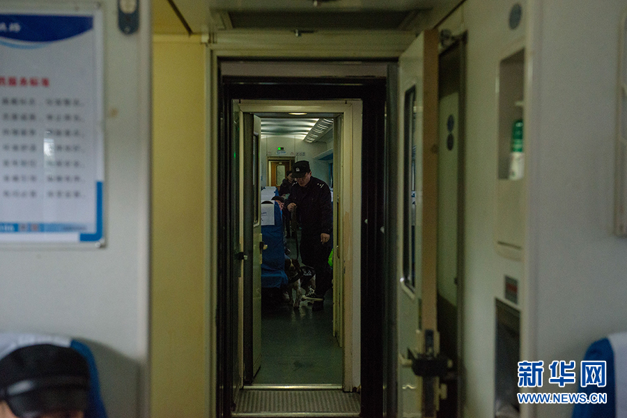 两岁多的太子,是重庆铁路公安处警犬工作队的一名“新兵”,这是太子在训犬员孟圻昕警官的带领下,在火车车厢内“检查”行李是否藏有易燃易爆物品。新华网 李相博 摄