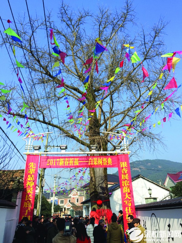 径山镇四岭村仕村自然村的父老乡亲,日前汇聚在一棵有数百年树龄的粗大银杏树下,举行2017新春祈福·白果树祭典活动,在白果树上扎上大红花和红丝带祈福,保护名木古树,传承民间民俗文化,守护精神家园,寄托着村民对幸福生活和美好未来的向往与企盼。