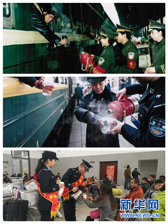 送上热水让寒冬充满温暖(上两图为春运资料图)。